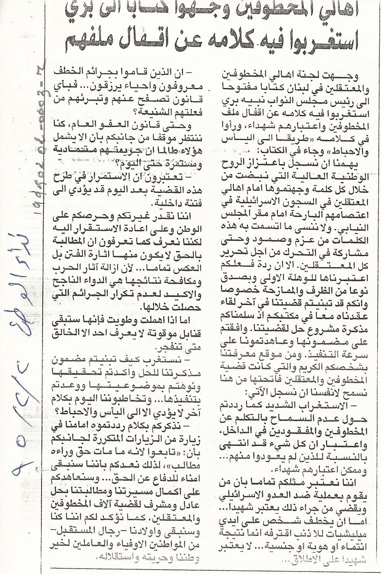 - ar اهالي المخطوفين وجهوا كتابا الى بري استغربوا فيه كلامه عن اقفال ملفهم