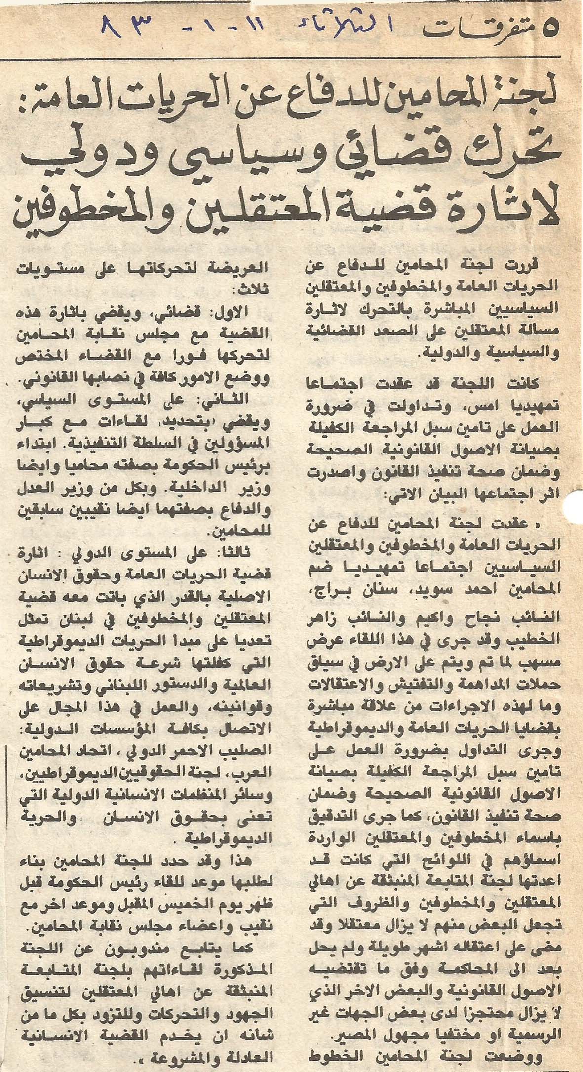 لجنة المحامين للدفاع عن الحريات العامة: تحرك قضائي وسياسي ودولي لاثارة قضية المعتقلين والمخطوفين