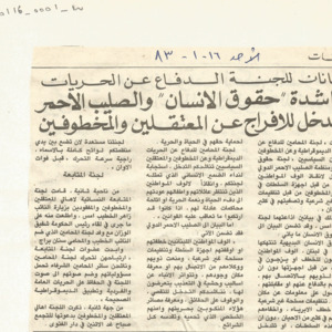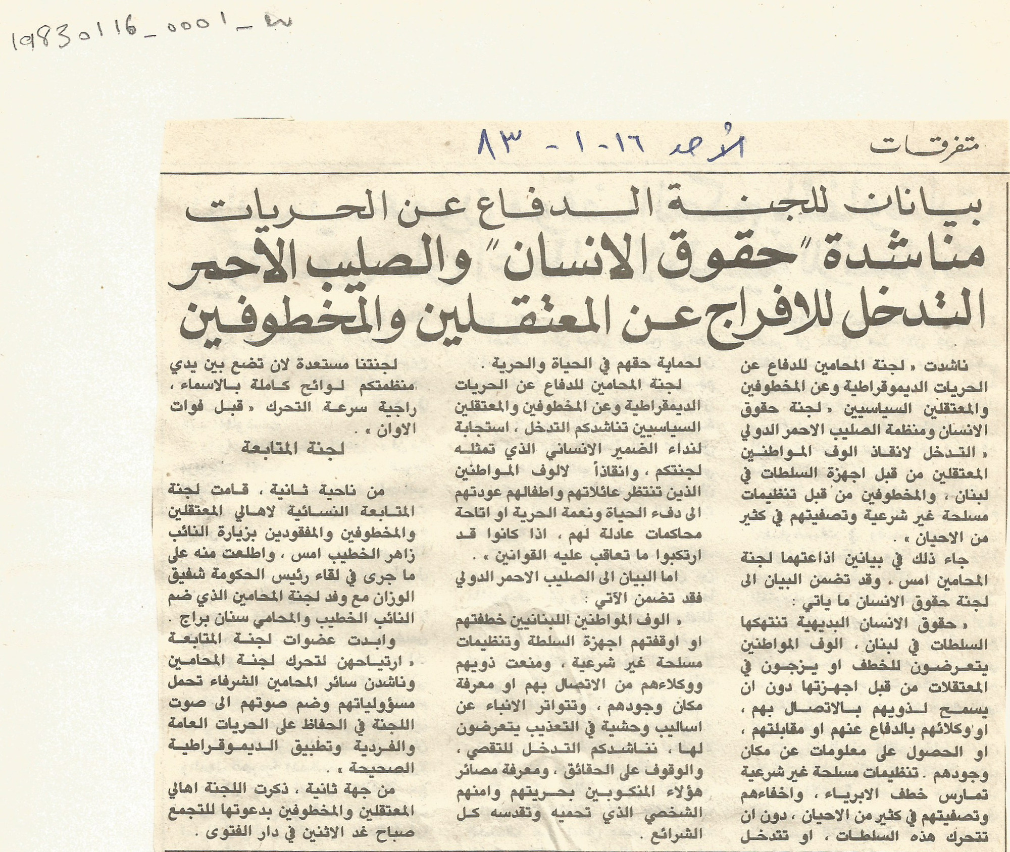 بيانان للجنة الدفاع عن الحريات، مناشدة حقوق الانسان والصليب الاحمر التدخل للافراج عن المعتقلين والمخطوفين