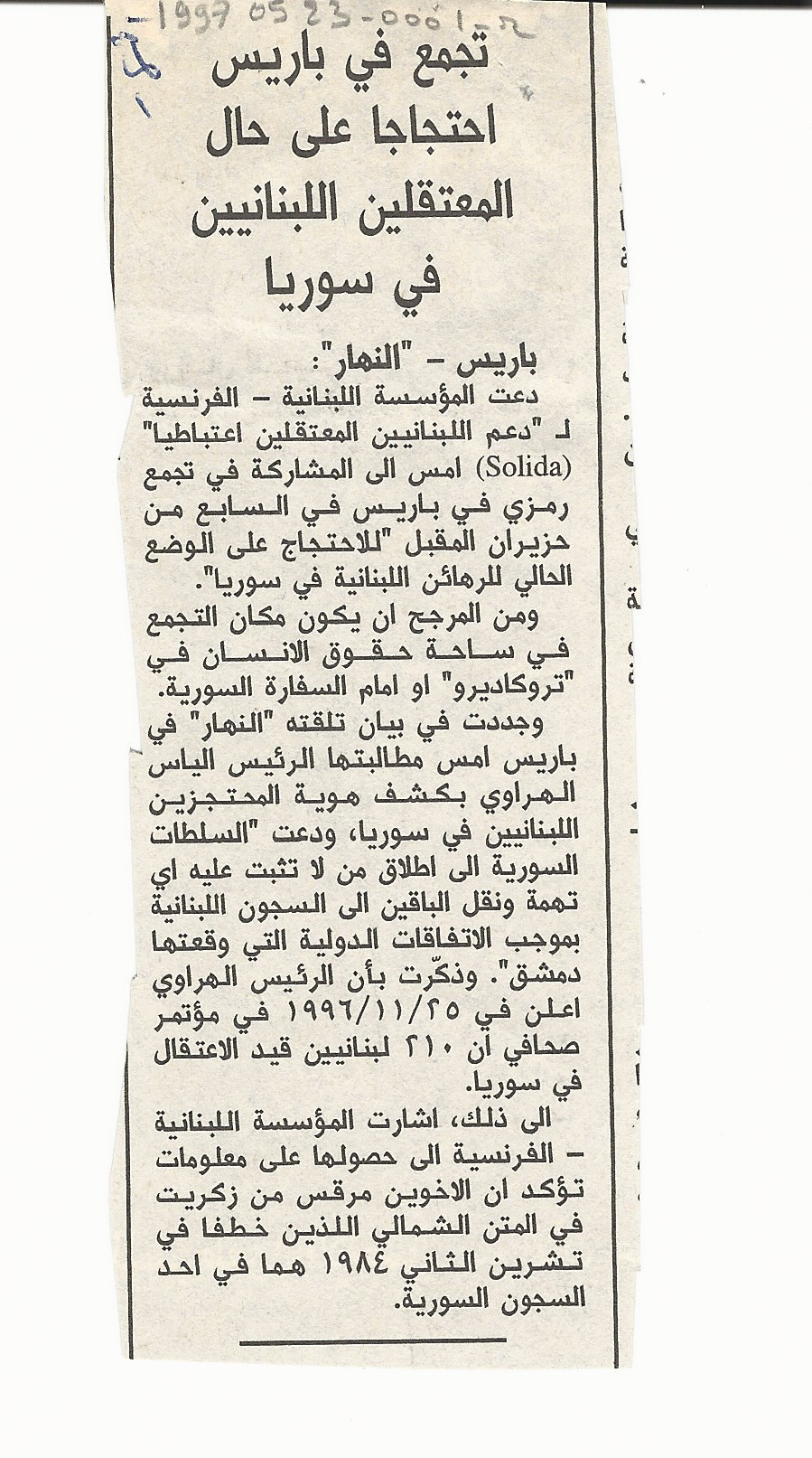 - en A gathering was held in Paris in protest at the situation of the Lebanese detained in Syria.