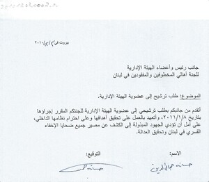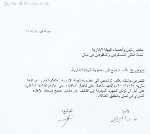 طلب ترشيح لعضوية الهيئة الادارية للجنة اهالي المخطوفين والمفقودين في لبنان كتاب، 1 صفحة -
