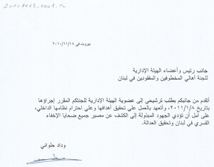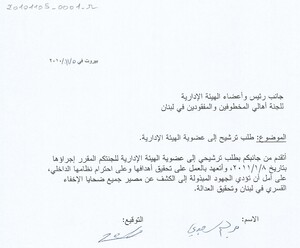 طلب ترشيح لعضوية الهيئة الادارية للجنة اهالي المخطوفين والمفقودين في لبنان رسالة، 1 صفحة -
