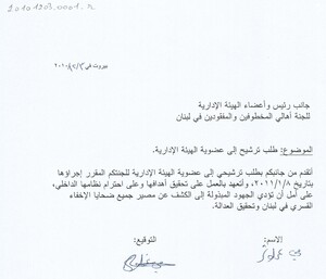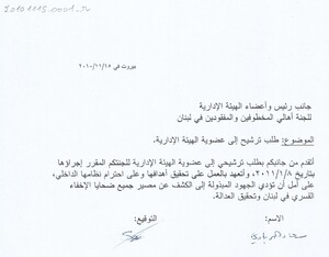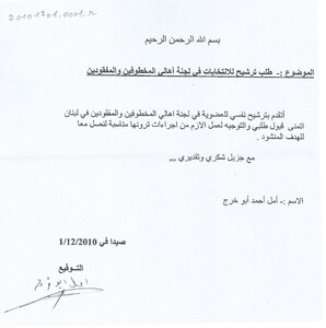 طلب ترشيح لعضوية الهيئة الادارية للجنة اهالي المخطوفين والمفقودين في لبنان كتاب، 1 صفحة -