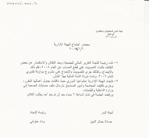 محضر اجتماع الهيئة الادارية للجنة الاهالي، الثلاثاء، 6، 1، 2009 مخطوط، 1 صفحة -