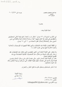 رسالة الى محافظ الجنوب لطلب اذن باقامة تجمع سلمي في صيدا كتاب، 1 صفحة، جداول -