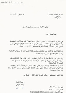 رسالة شكر الى الاستاذ موريس صحناوي للدعم المالي رسالة، 1 صفحة -