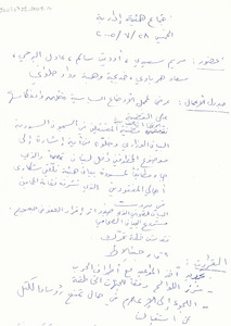 محضر اجتماع الهيئة الادارية للجنة الاهالي :الخميس، 28، 7، 2005 بيان، مخطوط، 1 صفحة -
