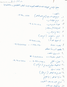 محضر اجتماع الهيئة العامة لجمعية لجنة اهالي المخطوفين والمفقودين مخطوط، 12 صفحة، جداول -