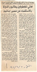 بعد أن تردد أن الدبلوماسيين الايرانيين أحياء: اهالي المخطوفين يطالبون الدولة بالاستقصاء عن مصير ابنائهم خبر، 1 صفحة -
