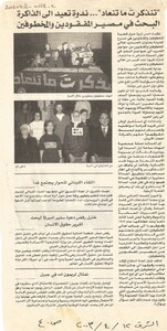 ندوة عن معاناة اهالي المخطوفين والمفقودين طالبت بالتقرير الرسمي وسألت عن مسؤولية الدولة مقال، 1 صفحة، صورة -
